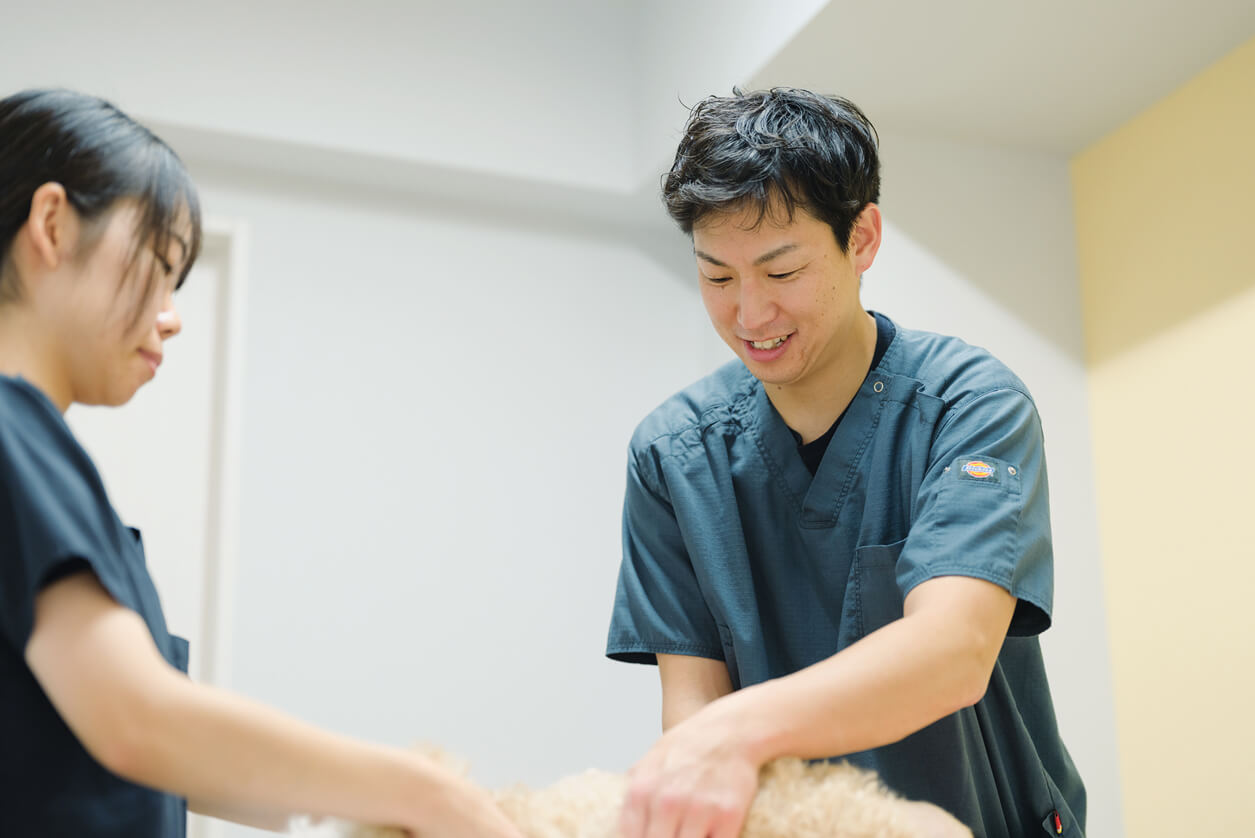 診療の補助、動物の保定、手術の準備と手術器具の管理、リハビリテーションなどが主な業務です。例えば1日に3件以上の手術があると使う器具が重なり、次の手術に間に合うように急いで再滅菌しなければなりませんが、仲間と協力して対処できた時などには、やりがいを感じます。